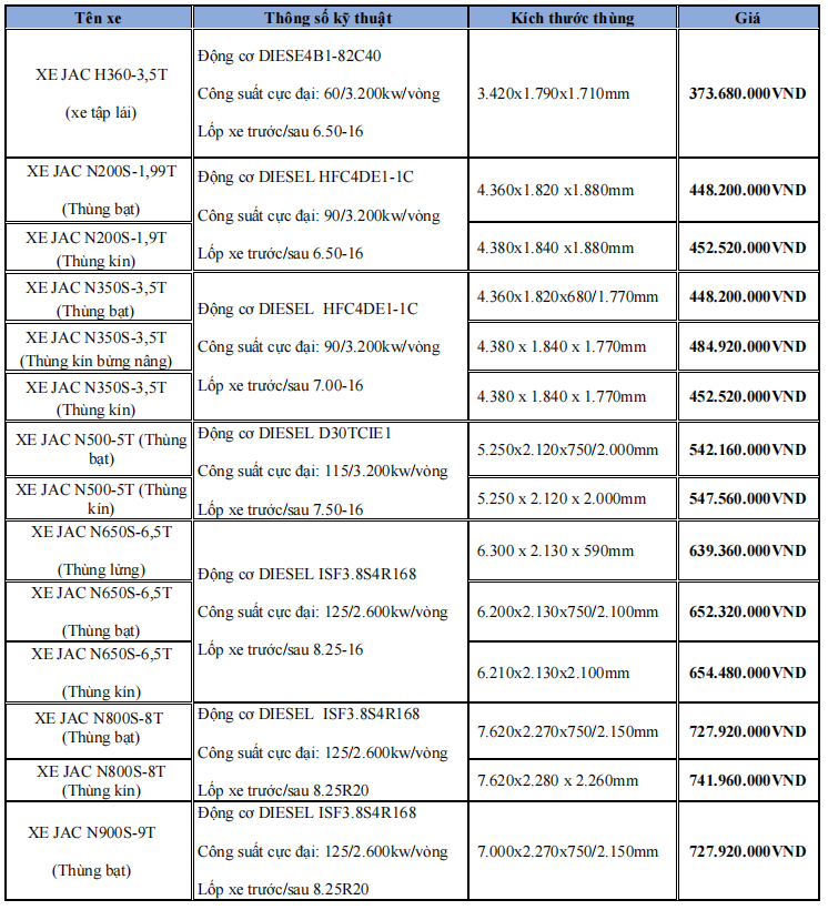 Xe tải JAC khá thông dụng tại thị trường Việt Nam với các ưu điểm như mức trọng tải đa dạng, tiết kiệm nhiên liệu, thiết kế đẹp mắt và động cơ khỏe. Các dòng xe tải JAC đa dạng về cả giá cả lẫn thiết kế và trọng tải. Công ty chúng tôi xin tran trọng gửi đến quý khách hàng bảng giá xe tải Jac, xe đầu kéo Jac tháng 04/2022